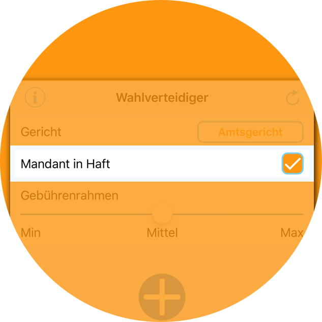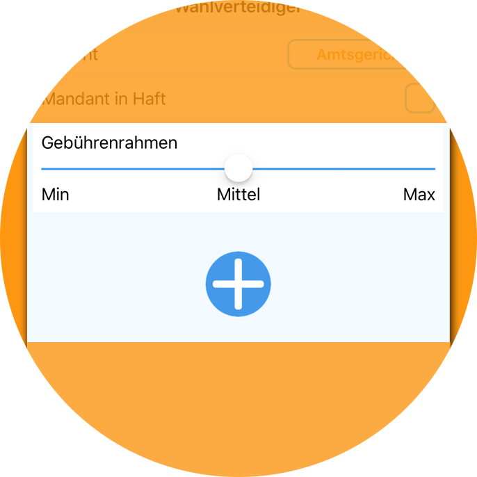 Legen Sie mit dem Schieberegler den Gebührenrahmen fest und fügen Sie mit dem Plus-Zeichen Gebührentatbestände hinzu.