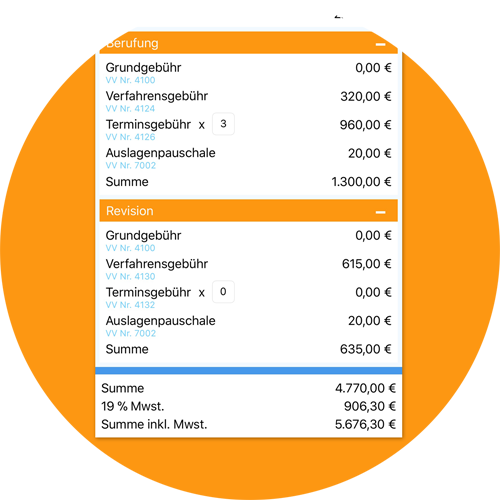 Die RVG App erstellt keine Rechnung, sie ist aber konzipiert, um mit ihr als Arbeitshilfe komplexe Abrechnungen mit Angabe der Vergütungsverzeichnisnummer gegenüber dem Mandanten im Beratungsgespräch oder gegenüber dem Gericht überall erstellen und kontrollieren zu können.